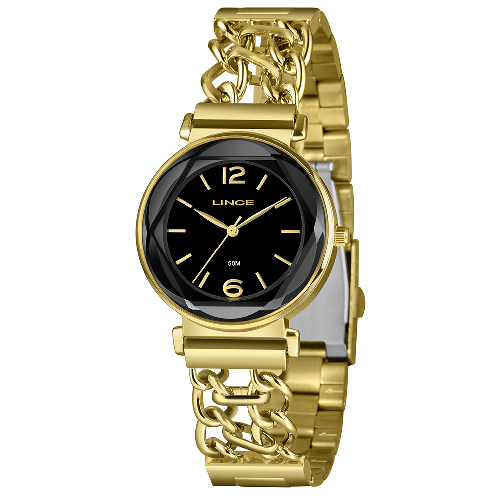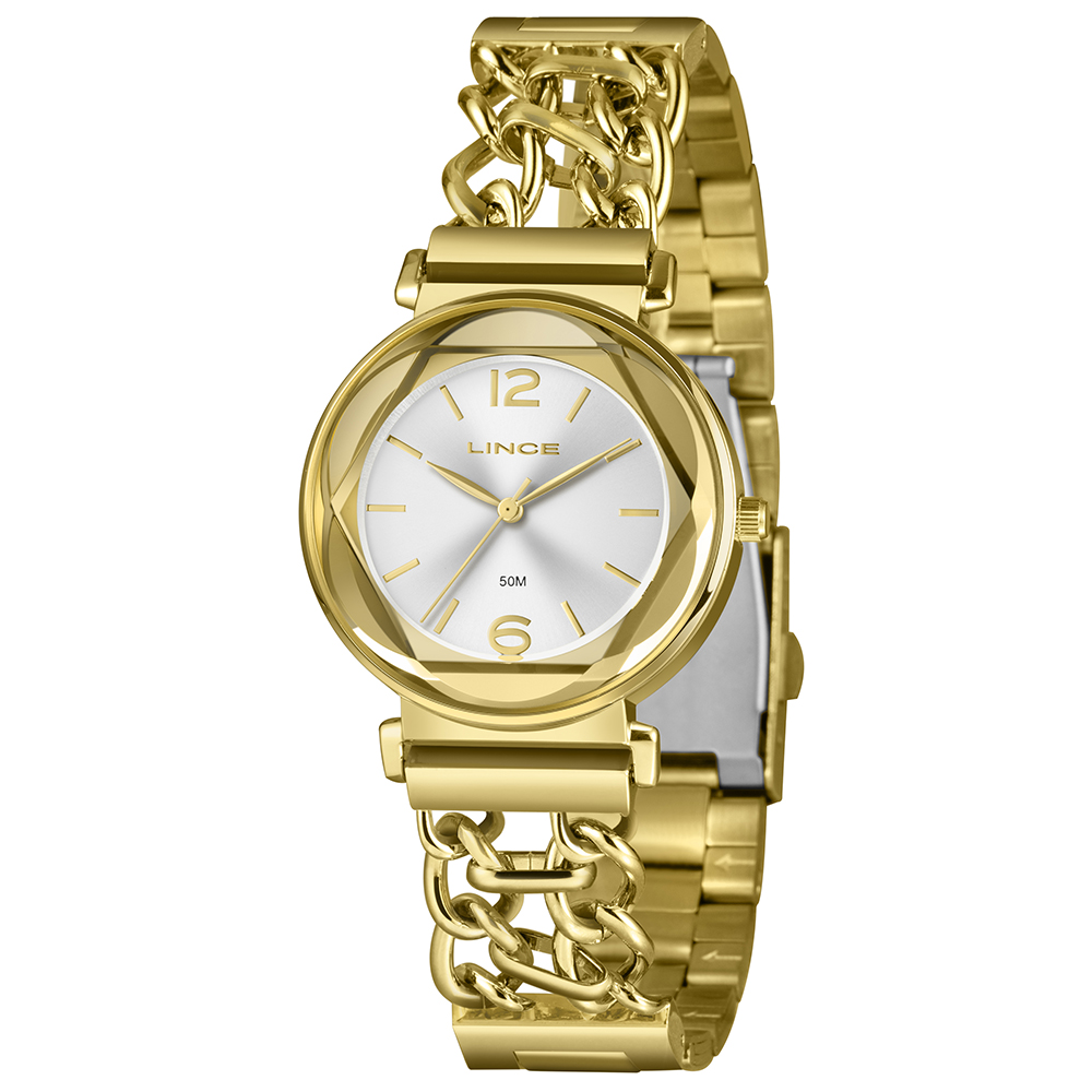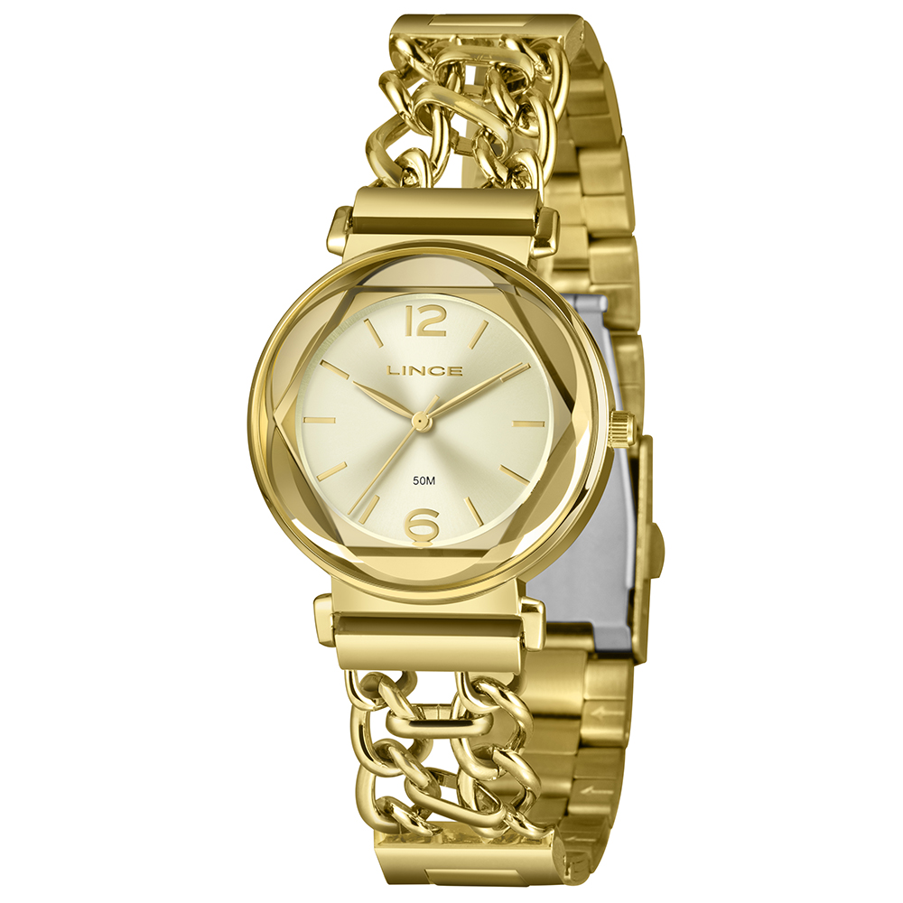 Características: com caixa dourada e pulseira em corrente dupla com fecho em aço + IPG