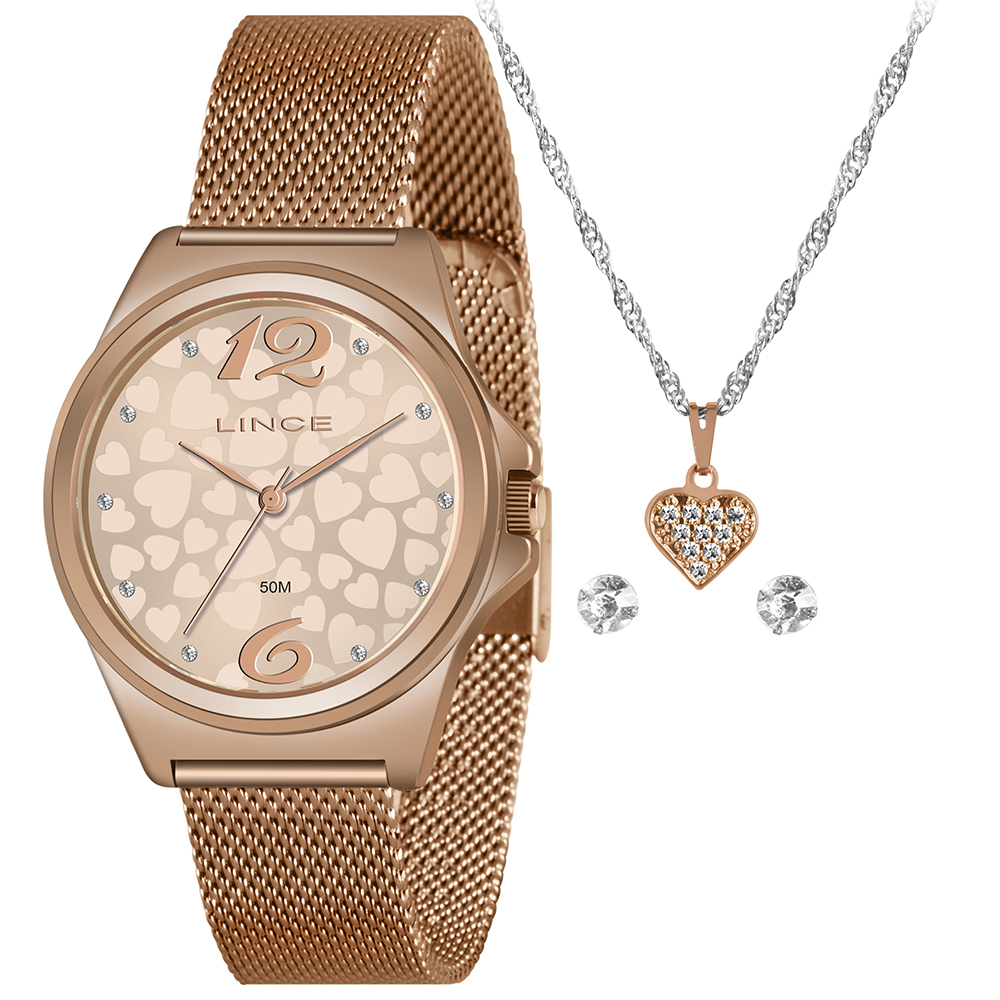 Características: com caixa rose gold e pulseira em aço tipo mesh, este produto acompanha uma gargantilha e um par de brincos (acessório/brinde sujeito a alteração).
