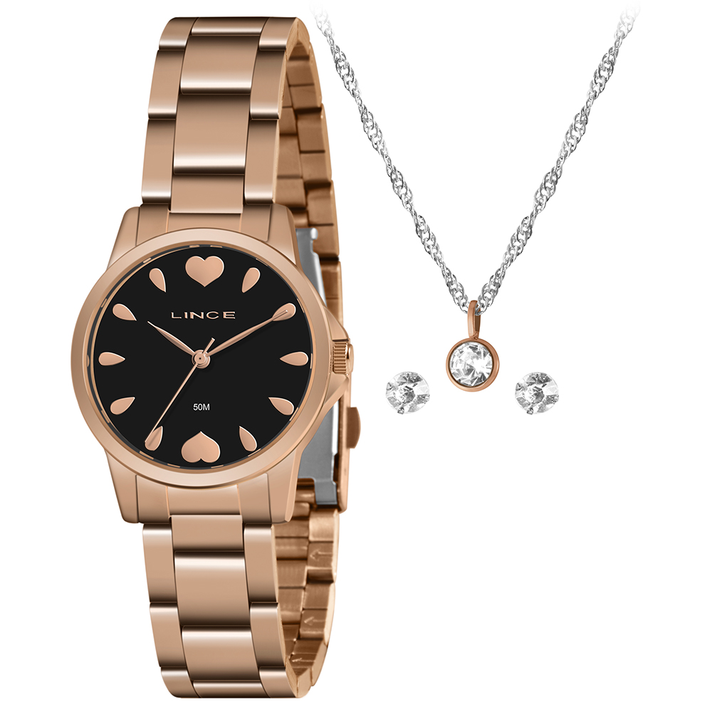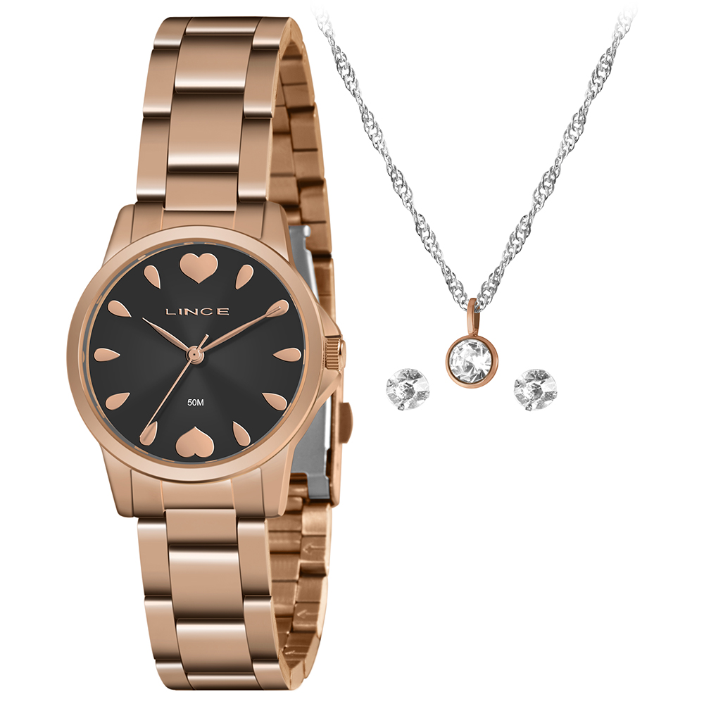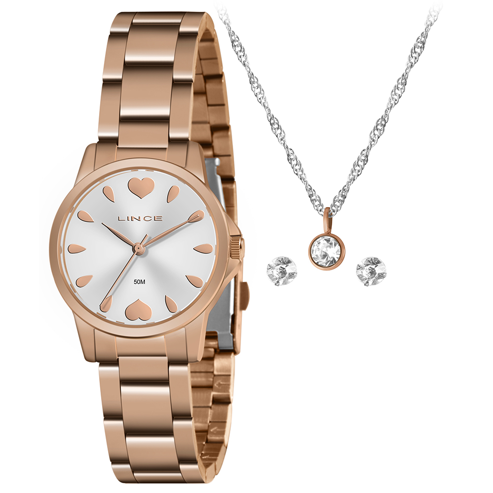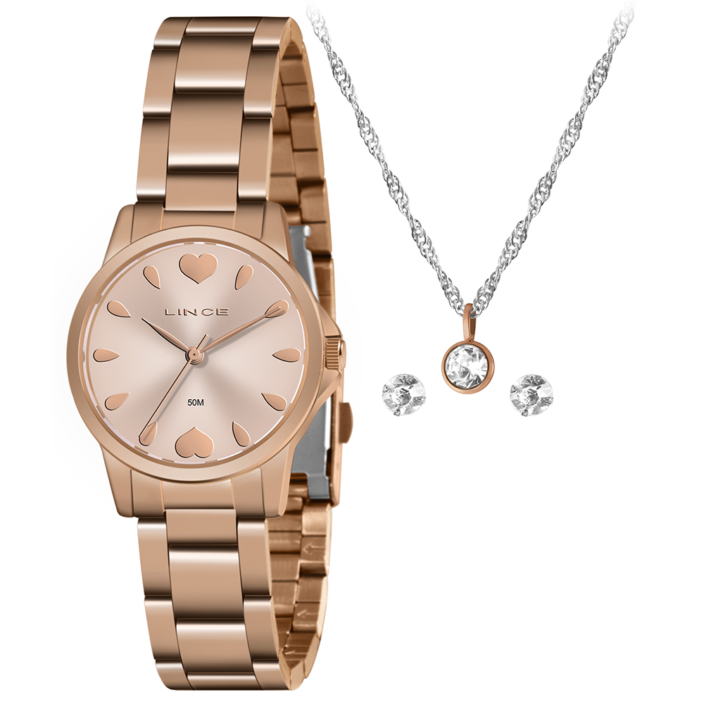 Características: com caixa rose gold e pulseira em aço, este produto acompanha uma gargantilha e um par de brincos (acessório/brinde sujeito a alteração).