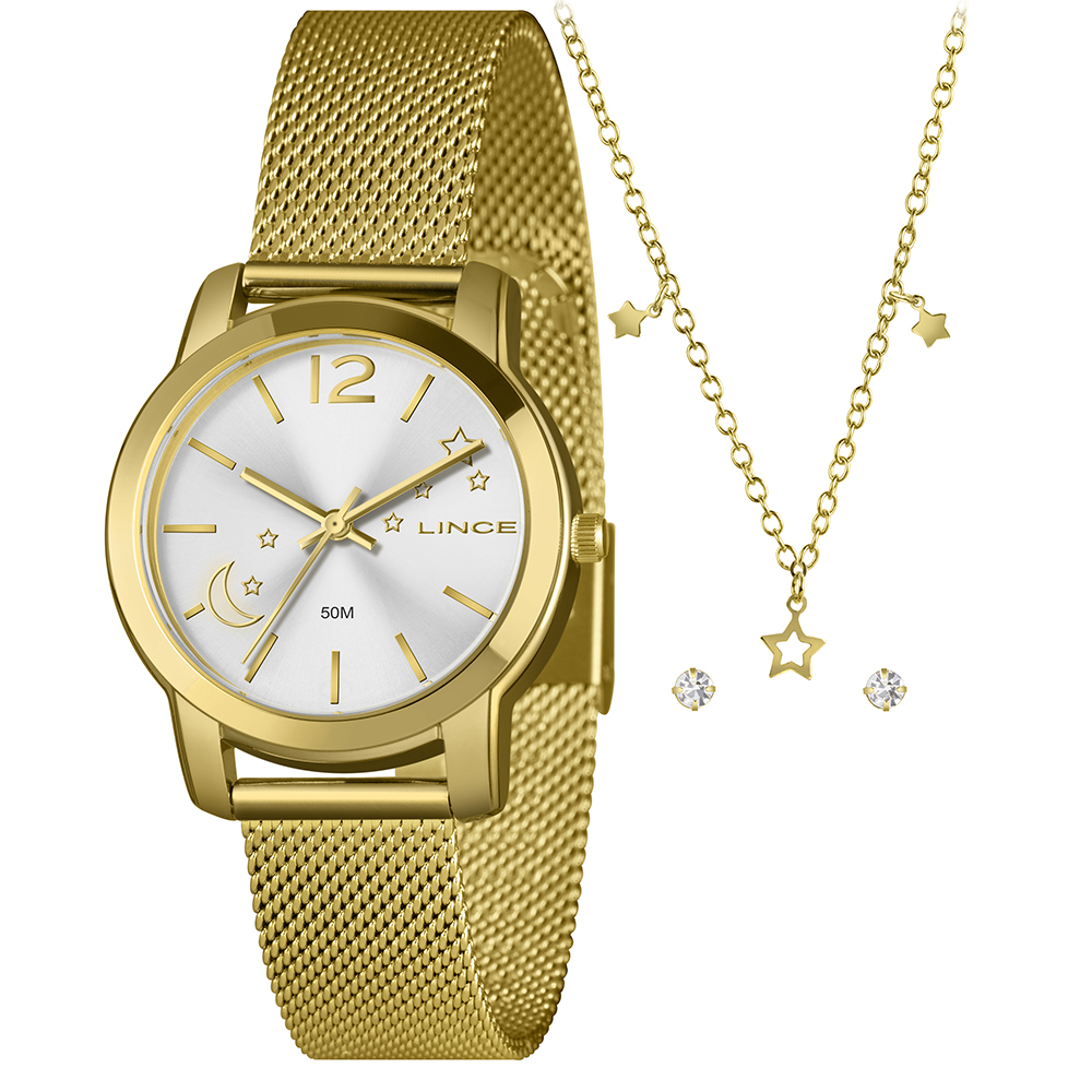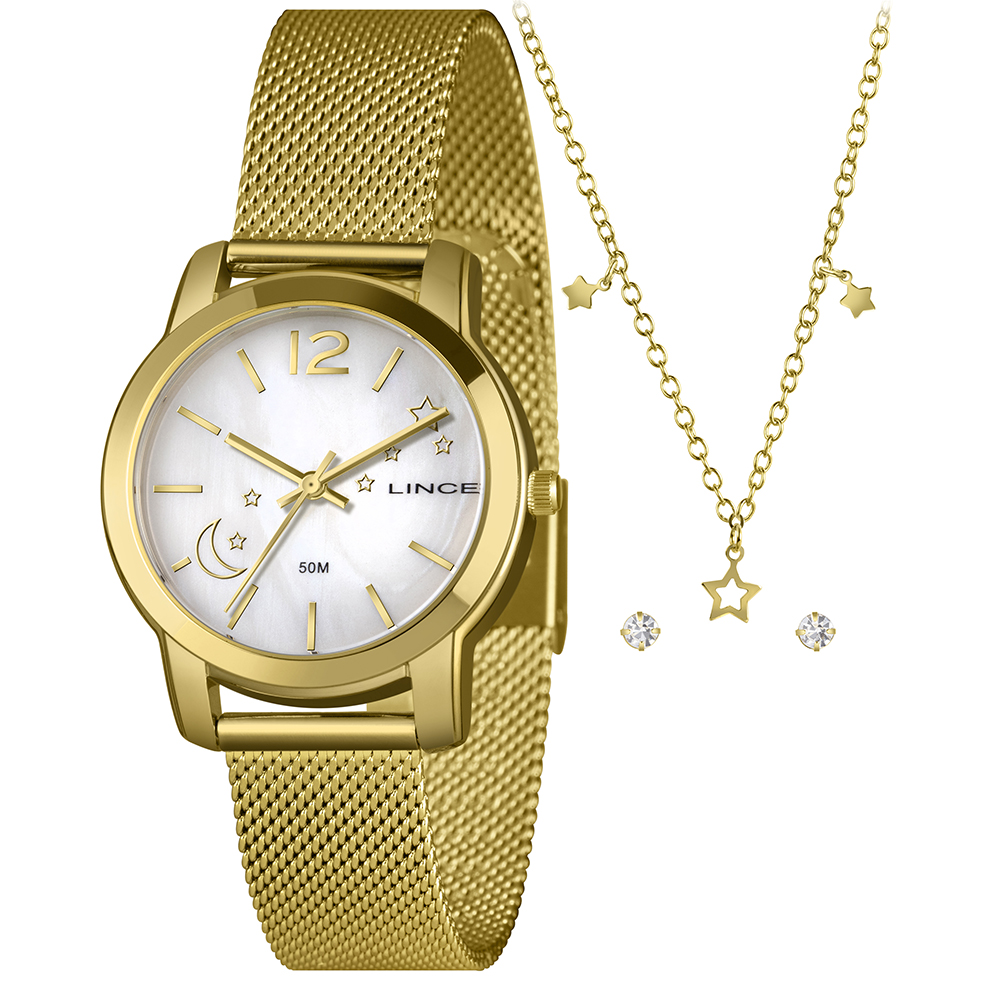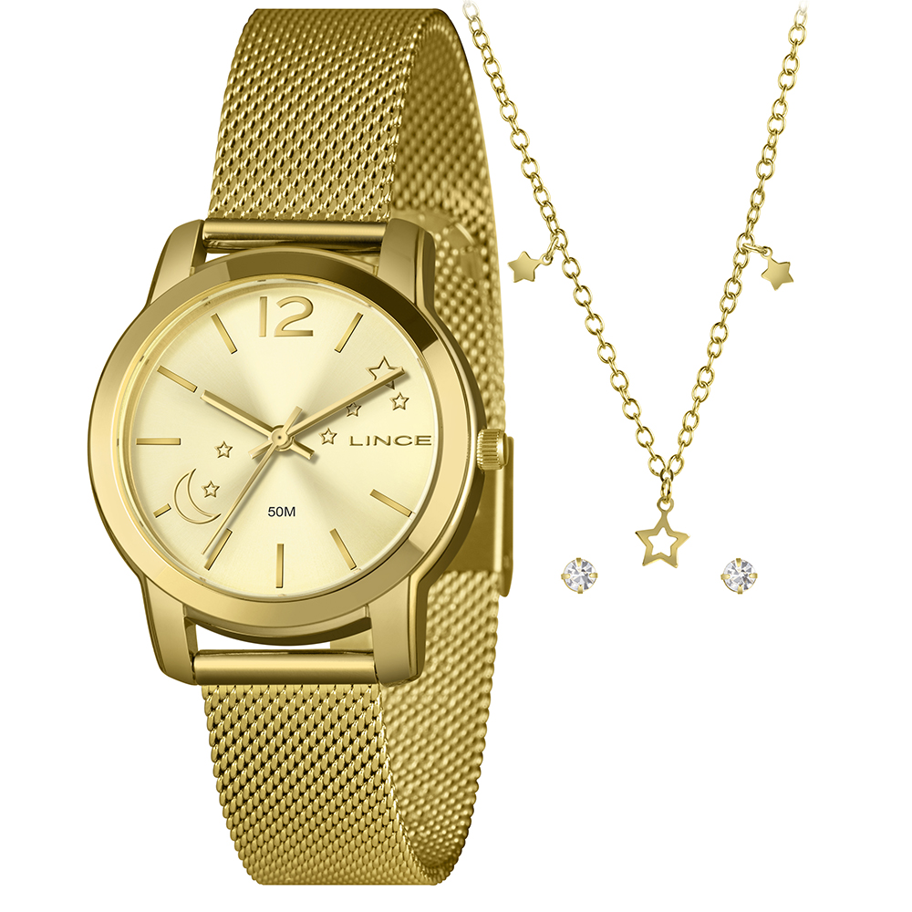 Características: com caixa DOURADO e pulseira tipo mesh em aço+ipg
