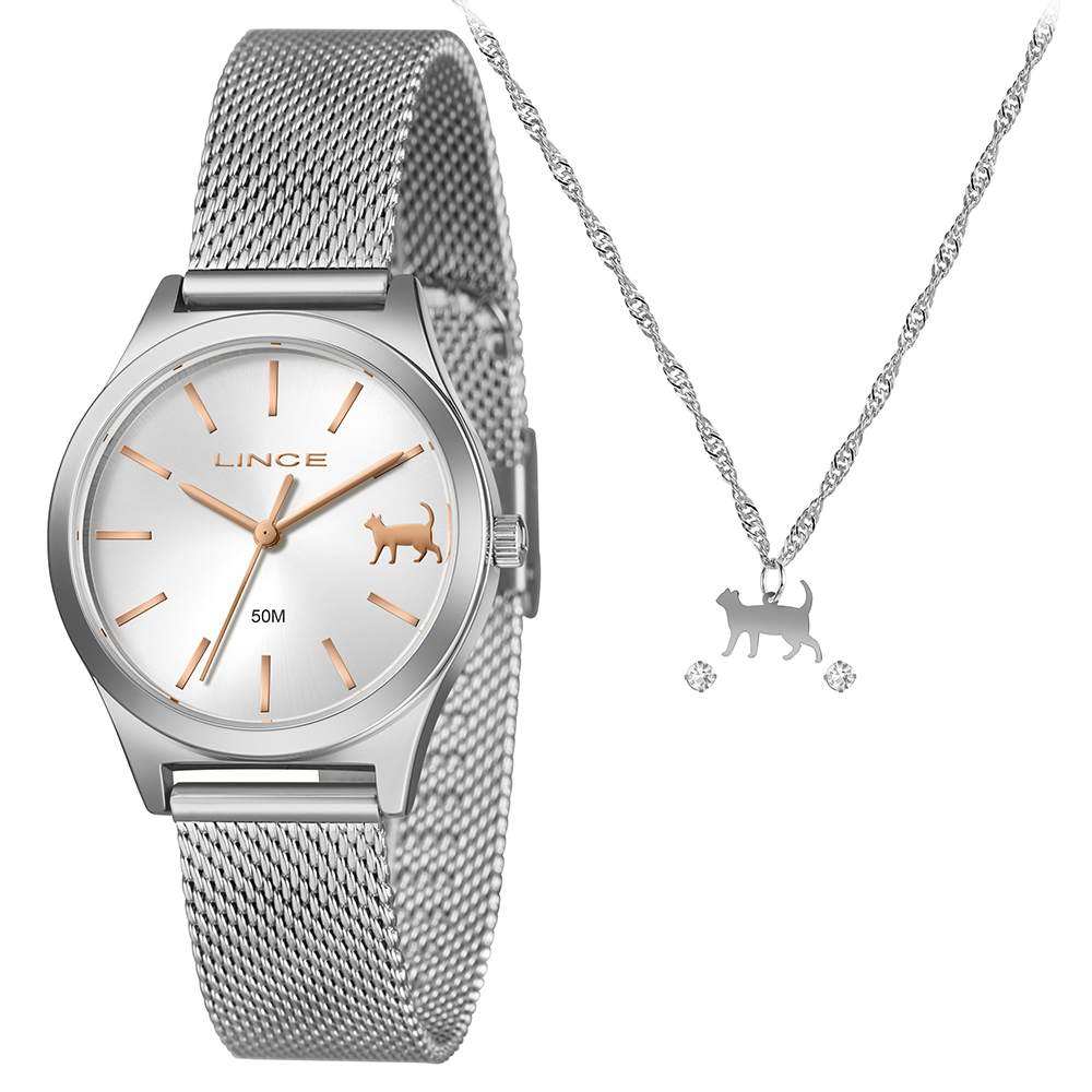 Características: com caixa PRATA e pulseira tipo mesh em aço