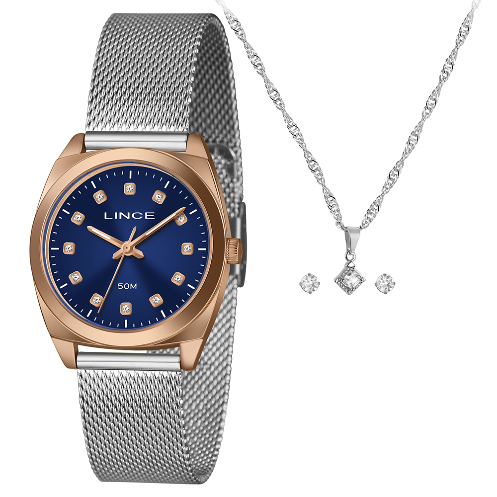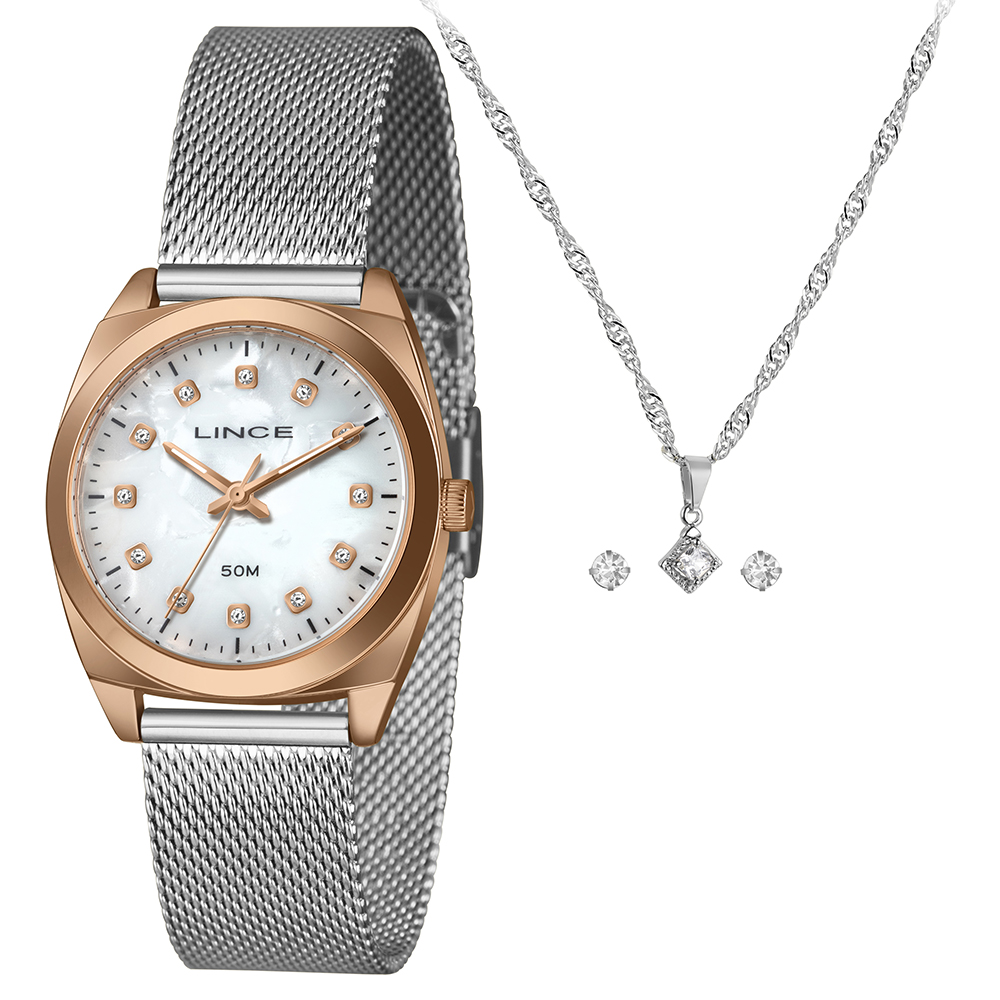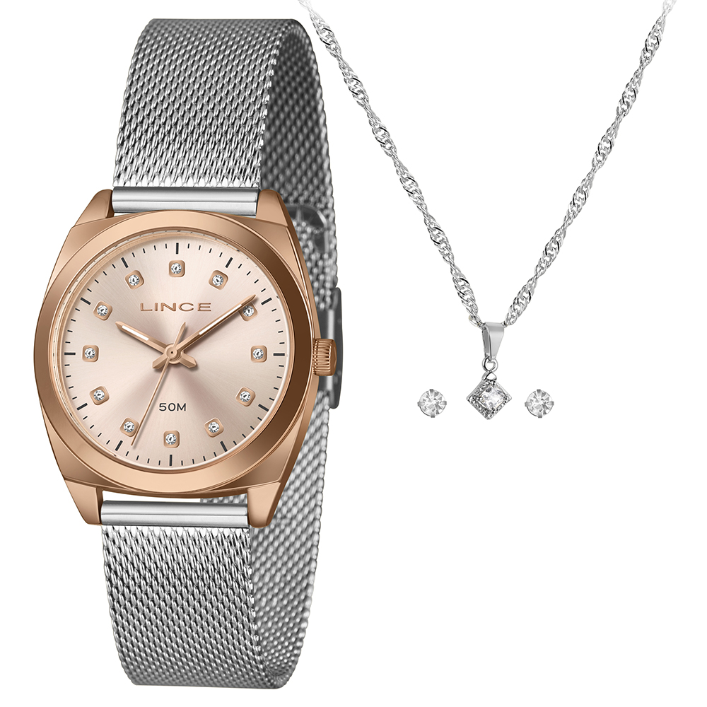 Características: com caixa ROSEGOLD e pulseira tipo mesh em aço