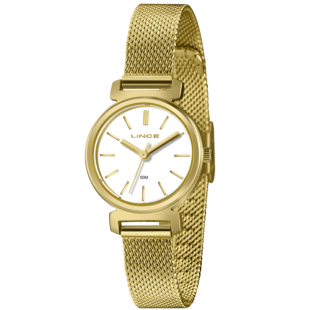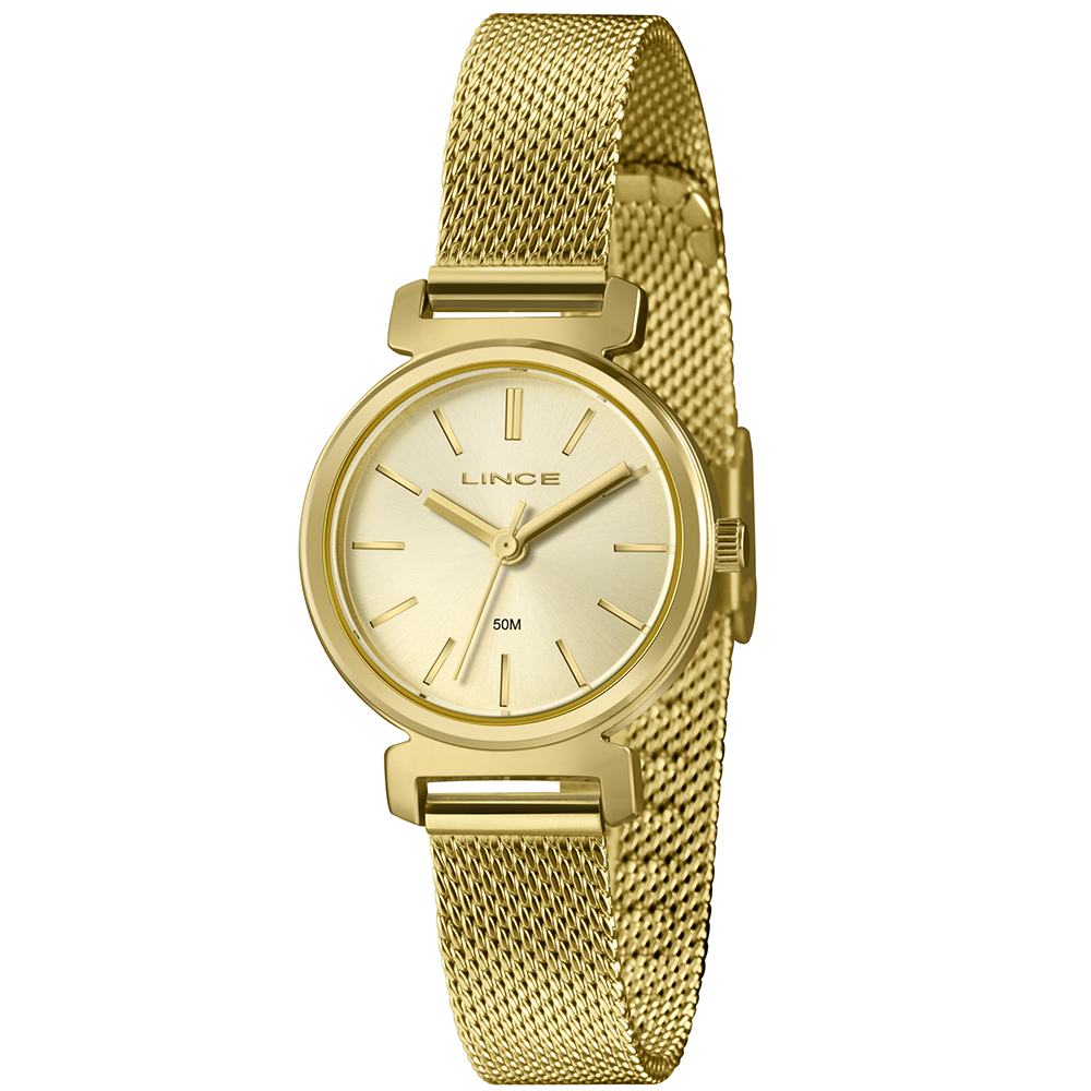 Características: com caixa DOURADO e pulseira tipo mesh em aço+ipg